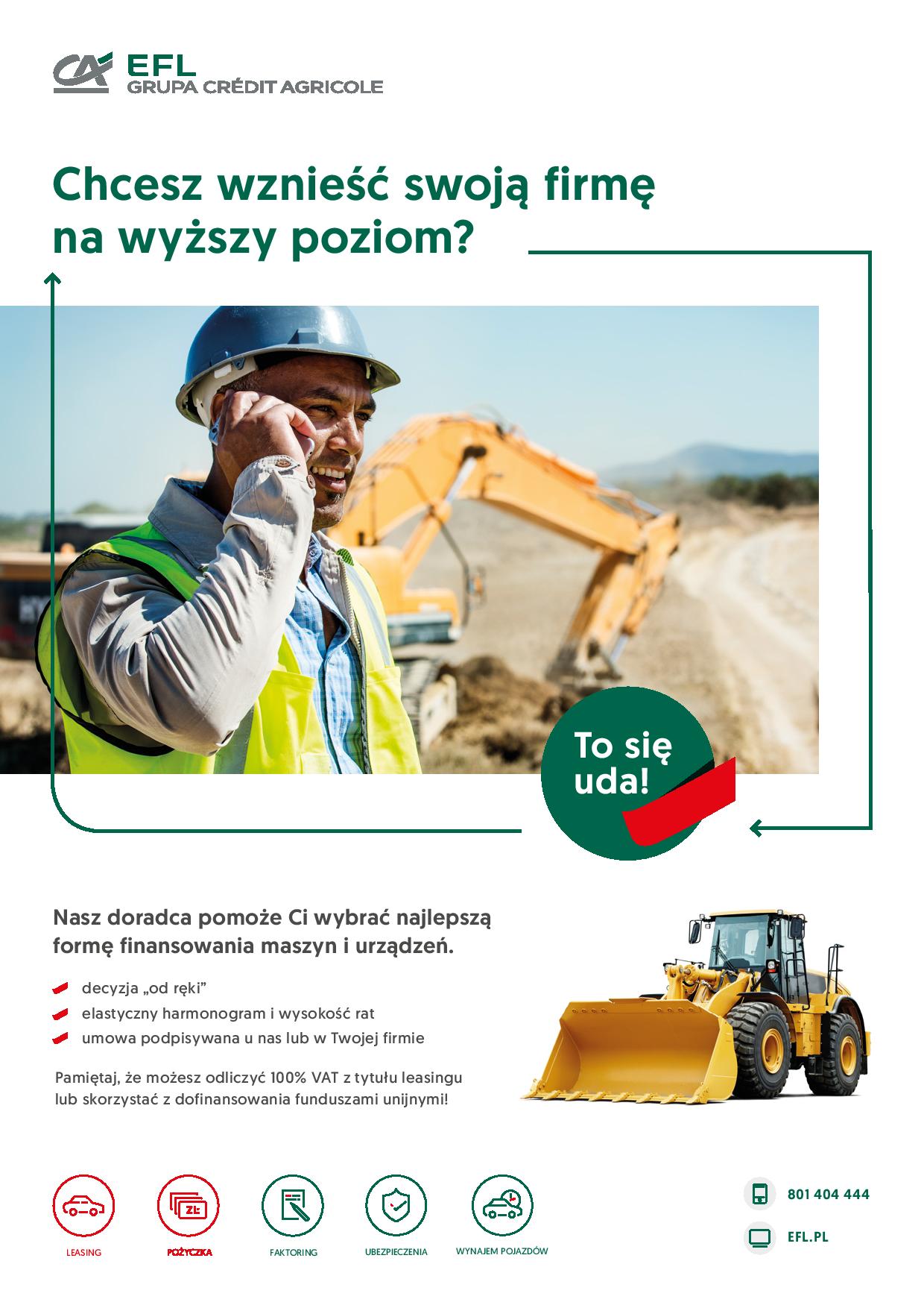 Sprzęt budowlany, zaraz po rolniczym, to najchętniej finansowane przy pomocy leasingu maszyny i urz?dzenia. Z danych Zwi?zku Polskiego Leasingu wynika, że w I półroczu br. firmy leasingowe sfinansowały prawie 8 tys. środków trwałych w „budowlance” o wartości ponad 1,7 mld zł, co oznacza dynamikę na poziomie aż 64% r/r. Po raz kolejny numerem jeden wśród leasingodawców obecnych w branży budowlanej jest EFL. Z portfelem umów o wartości ponad 298 mln zł i dynamik? na poziomie 42% r/r, udział firmy w finansowaniu maszyn budowlanych w I półroczu br. wyniósł ponad 17%.