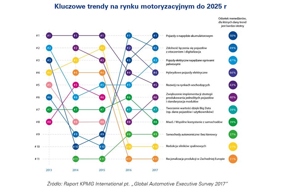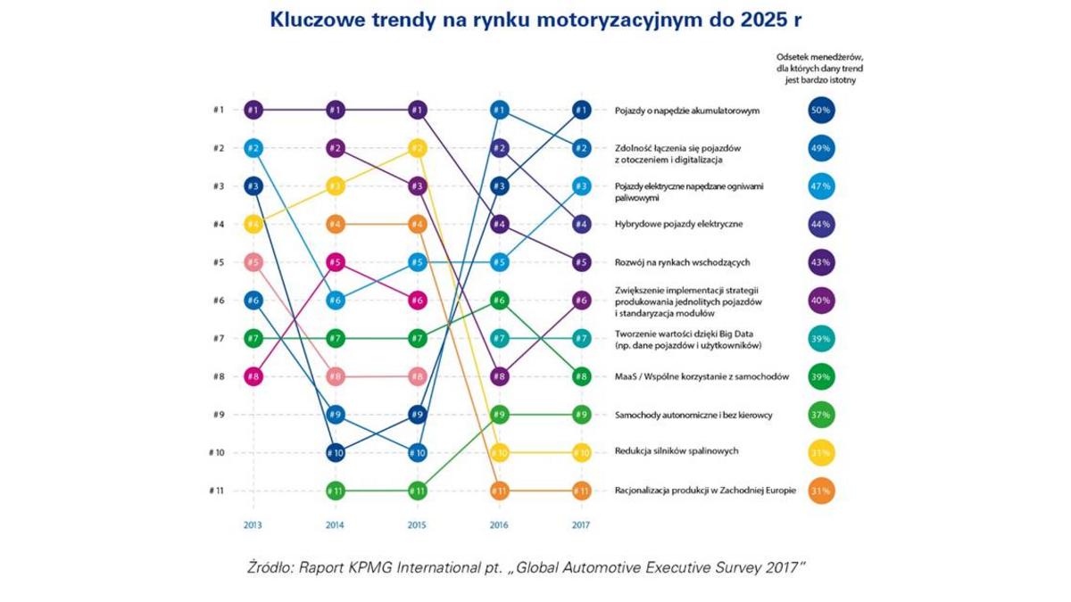 Według 953 przedstawicieli kadry zarz?dzaj?cej z branży motoryzacyjnej z 42 krajów rozwój pojazdów z napędem elektrycznym będzie kluczowym trendem na rynku do 2025 r. Na to zjawisko wskazało 50 proc. respondentów i tym samym elektromobilność po raz pierwszy w historii badania stała się najważniejszym trendem w tym sektorze.
