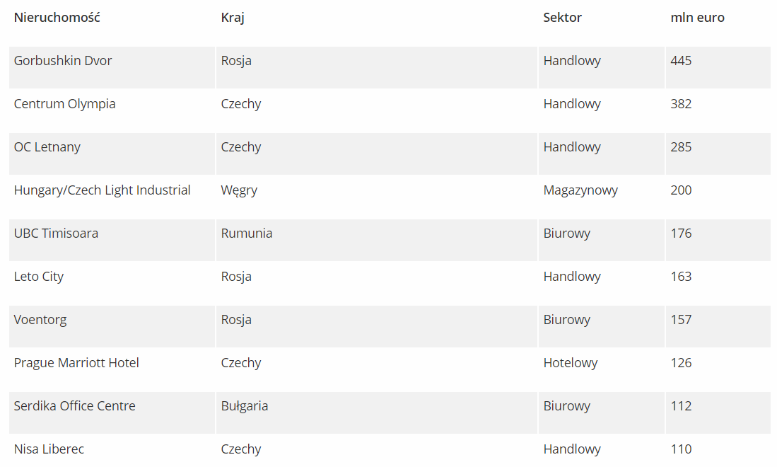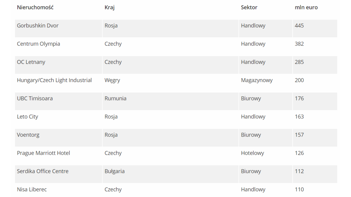 ** Wartość ta uwzględnia nieruchomości biurowe, handlowe, magazynowe i obiekty hotelowe.