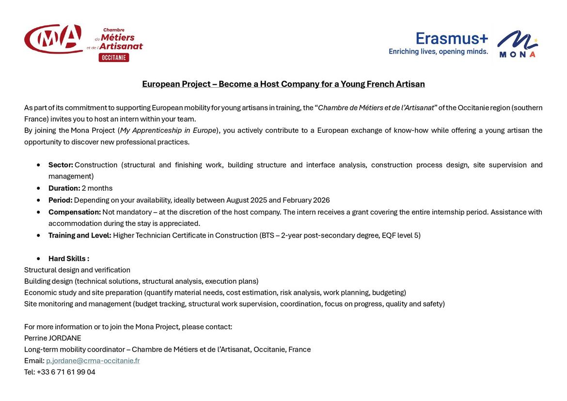 For more information or to join the Mona Project, please contact: Perrine JORDANE Long-term mobility coordinator – Chambre de Métiers et de l’Artisanat, Occitanie, France Email: p.jordane(@)crma-occitanie.fr Tel: +33 6 71 61 99 04