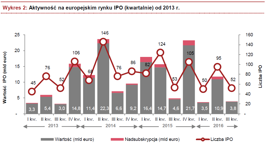 - Ł?czna wartość IPO w Europie w trzecim kwartale 2016 r. była tylko o 17% niższa w porównaniu z analogicznym okresem ubiegłego roku.