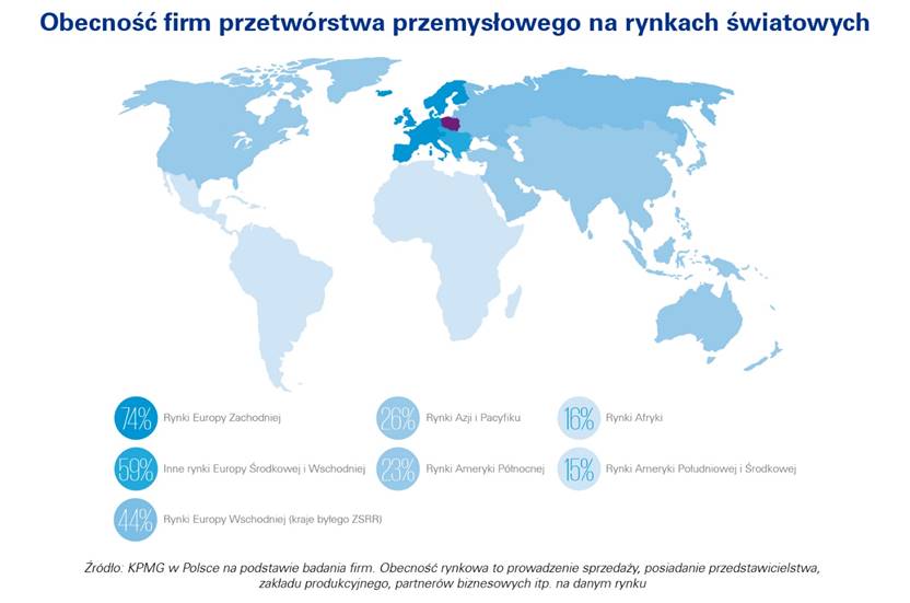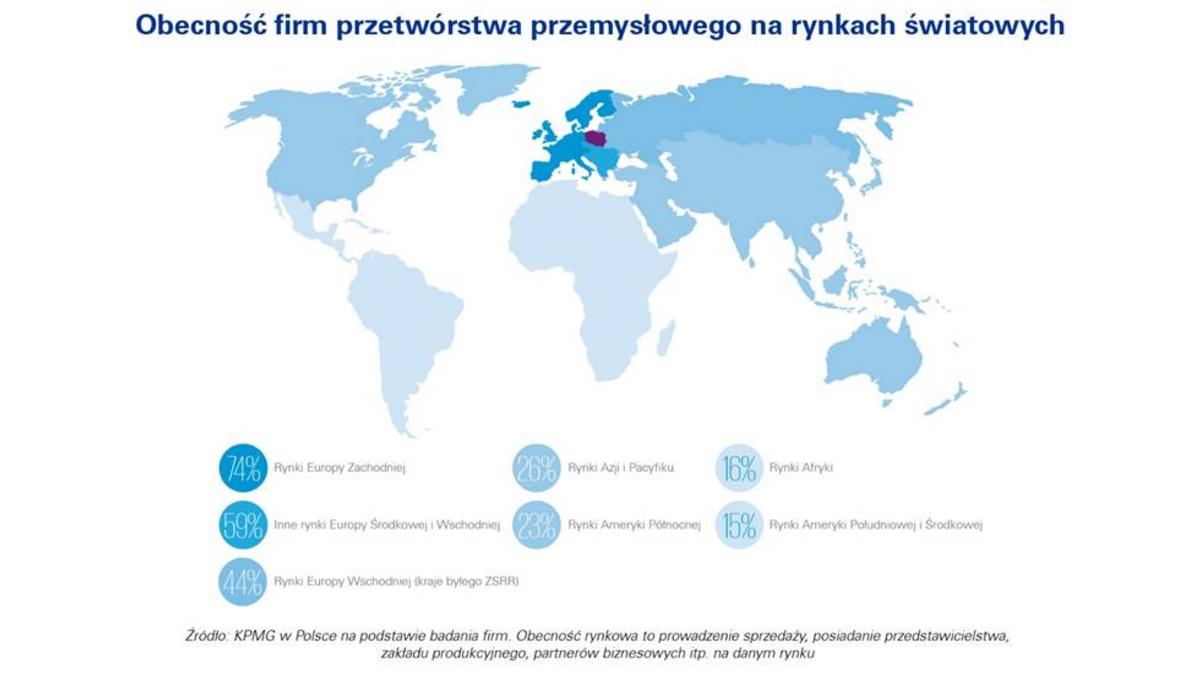 Na przestrzeni ostatnich 4 lat istotnie wzrosło znaczenie zagranicznych rynków dla firm produkcyjnych działaj?cych w Polsce.Najbardziej popularne s? niezmiennie kraje Europy Zachodniej i Europy Środkowo-Wschodniej – jest tam obecnych odpowiednio 74% i 59% badanych firm produkcyjnych z Polski. Przedsiębiorcy coraz częściej jednak otwieraj? przedstawicielstwa i fabryki także na dalszych geograficznie rynkach. Warto zwrócić uwagę, że połowa przedsiębiorstw zamierza zwiększyć swój udział na rynkach Azji i Pacyfiku oraz Ameryki Północnej.