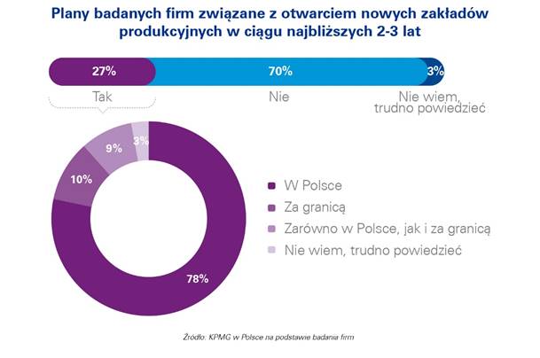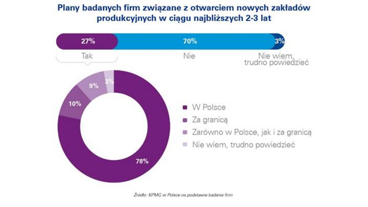 Z badania przeprowadzonego przez KPMG wynika, że przedsiębiorstwa produkcyjne będ? inwestować przede wszystkim w maszyny i urz?dzenia, czyli aktywa pozwalaj?ce na zwiększenie mocy produkcyjnych oraz poziomu sprzedaży. W ci?gu następnych 2-3 lat 27% ankietowanych planuje inwestować w nowe zakłady produkcyjne. Zdecydowana większość przedsiębiorstw chce otworzyć zakład w Polsce (78% planuj?cych otwarcie nowego zakładu).