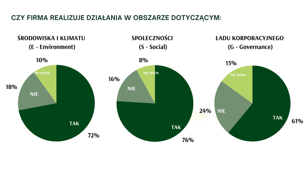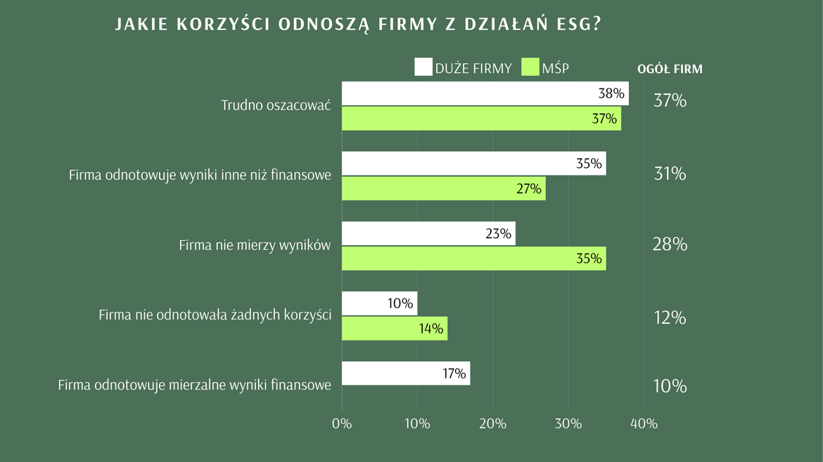 Firmy nadal mają trudności z określeniem rezultatów działań podejmowanych w zakresie zrównoważonego rozwoju. Jedynie duże organizacje, które posiadają zasoby ludzkie, finansowe i merytoryczne potrafią określić mierzalne korzyści (17% respondentów z dużych firm i ani jedna firma MŚP), natomiast 31% wszystkich przedsiębiorstw odnotowuje wyniki inne niż finansowe, związane najczęściej z poprawą wizerunku, zaangażowaniem pracowników, czy relacjami z interesariuszami. Firmy z sektora MŚP najczęściej nie mierzą wyników (35%) lub jest im trudno je określić (37%). Brak jakichkolwiek korzyści z prowadzonych działań ESG deklaruje co dziesiąta duża firma i co siódma z sektora MŚP.