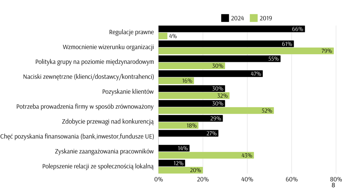 Po raz pierwszy, to regulacje stały się najważniejszym powodem angażowania się firm w obszar ESG (wzrost z 4% w 2019 do 66% w 2024). Na drugim miejscu znalazły się kwestie wizerunkowe, które są bardziej istotne dla firm z sektora MŚP (67%) niż dla firm dużych (57%). W ciągu ostatnich kilku lat istotnym czynnikiem stały się również oczekiwania i naciski ze strony klientów, pracowników, społeczności (57% wskazań w roku 2024 wobec 16% w roku 2019).