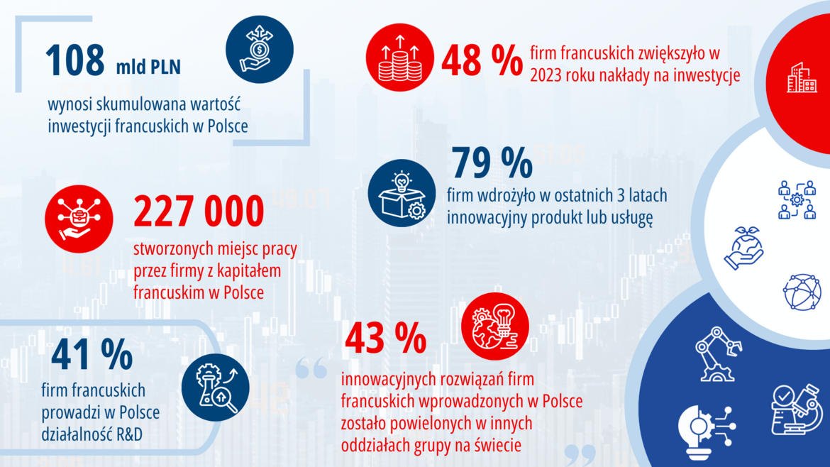 Od ponad trzech dekad firmy francuskie aktywnie uczestniczą w polskim życiu gospodarczym, odgrywając istotną rolę w transformacji krajowej gospodarki. Ich obecność jest zauważalna w innowacyjnych, jak i kluczowych dla infrastruktury i efektywności gospodarczej sektorach.