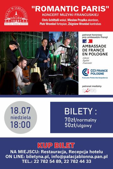 Wyjątkowy koncert muzyki francuskiej w wykonaniu doskonałych artystów: Chris Schittulli - wokal, Wiesław Prządka - akordeon, Piotr Wrombel - fortepian i Zbigniew Wrombel - kontrabas. Wszystko w wyjątkowej scenerii Pałacu w Jabłonnie, na granicy z Białołęką.