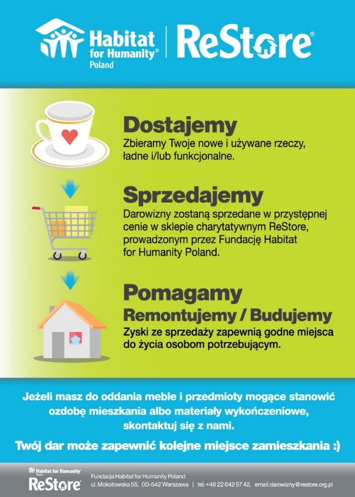 ReStore to wyjątkowy sklep charytatywny i przestrzeń warsztatowa prowadzone przez Fundację Habitat for Humanity Poland na warszawskim Targówku. Sklep oferuje meble, artykuły wyposażenia wnętrz i materiały wykończeniowe z drugiej ręki. Trafiają tu m.in. końcówki serii lub obiekty powystawowe od partnerskich firm. Dzięki temu firmy realizują założenia programów CSR z zakresu zero waste. Całość zysku jest przeznaczana na działalność statutową Fundacji Habitat for Humanity Poland, czyli pomoc osobom w trudnej sytuacji mieszkaniowej i przeciwdziałanie bezdomności.