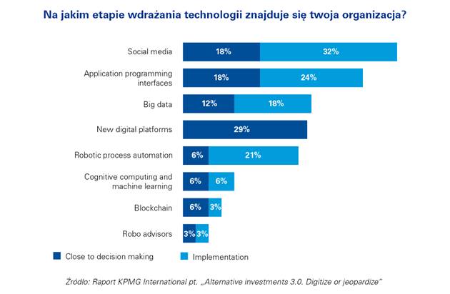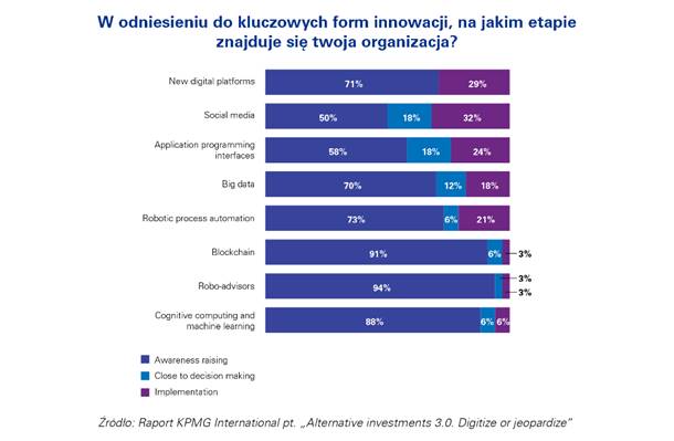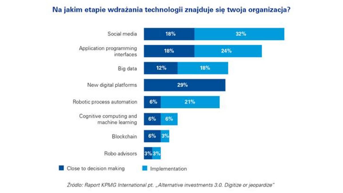 Mniej niż jedna trzecia wszystkich respondentów badania KPMG stwierdziła, że jest na etapie wdrażania kluczowych innowacji, natomiast jedynie 3 proc. funduszy hedgingowych i firm typu private equity wdrożyło do swojej organizacji zaawansowane technologie, takie jak blockchain.