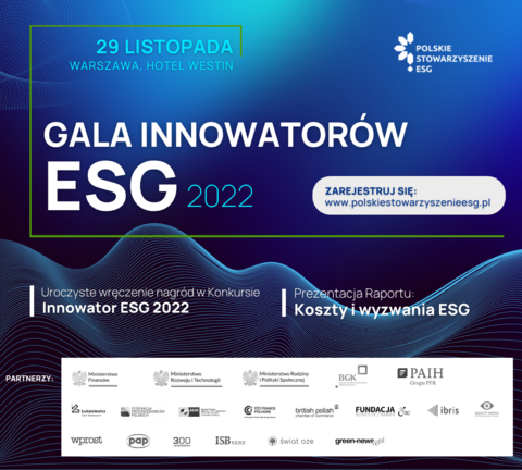 Już 29 listopada w Hotelu Westin odbędzie się Gala Innowatorów ESG 2022. Wydarzenie połączone jest z premierą Raportu „Koszty i wyzwania ESG” uroczystym wręczeniem nagród laureatom „Konkursu Innowator ESG 2022”. Organizatorem Gali jest Polskie Stowarzyszenie ESG, patronami: Ministerstwo Finansów, Ministerstwo Rozwoju i Technologii, Ministerstwo Rodziny i Polityki Społecznej, Bank Gospodarstwa Krajowego, PAIH. Partnerami wydarzenia zostali: Sieć Badawcza Łukasiewicz, Federacja Przedsiębiorców Polskich, Grupa Marriott, Polsko – Niemiecka Izba Przemysłowo – Handlowa, Francusko-Polska Izba Gospodarcza, Brytyjsko-Polska Izba Handlowa, Fundacja Biznes Bez Barier, Instytut Badań Rynkowych i Społecznych IBRiS oraz firma badawcza Quality Watch.