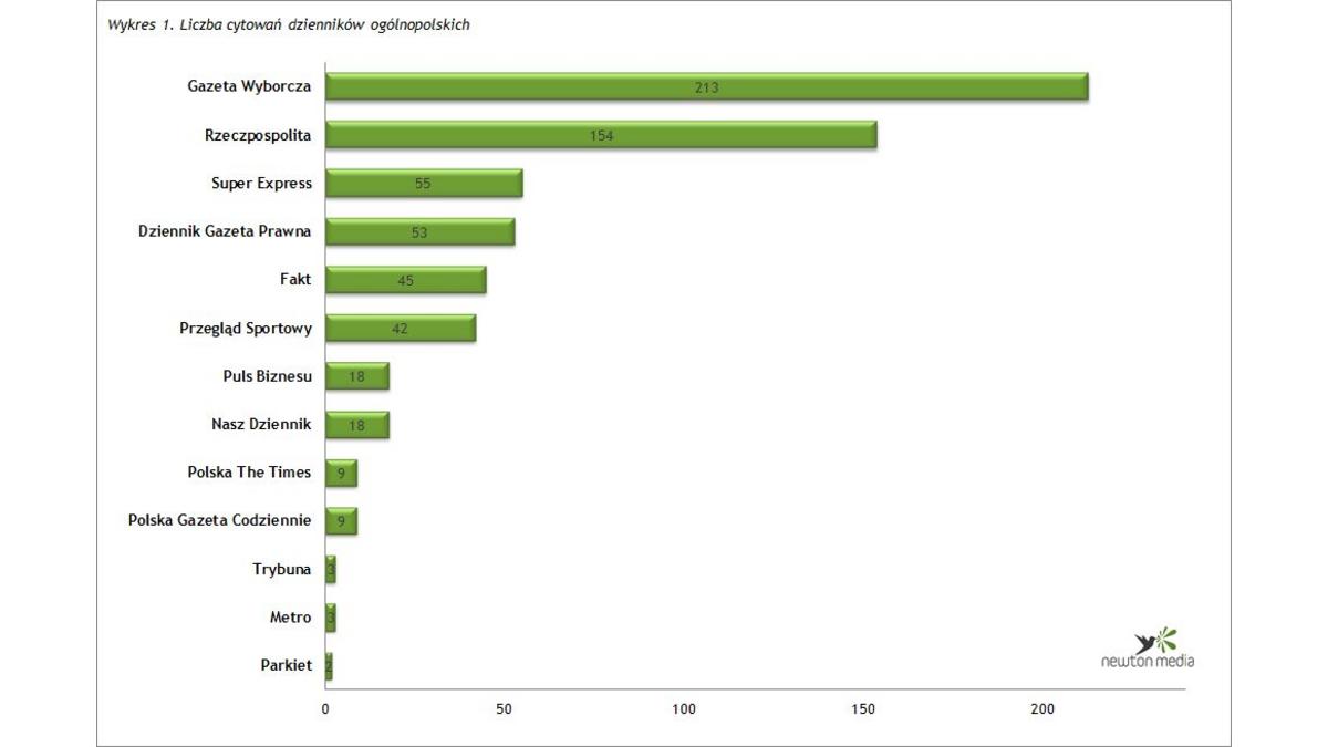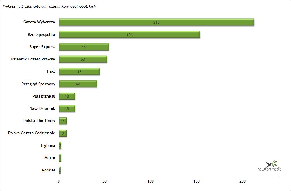 <p style="text-align: justify;"><span style="font-size: small;"><strong>W lutym i w styczniu wyniki Rankingu Cytowań i Informacji NEWTON Media okazały się bardzo zbliżone – wśród dzienników ogólnopolskich liderem cytowań była <em>Gazeta Wyborcza</em>, a wśród tygodników najczęściej cytowany był <em>Wprost</em>.<br /><strong>Począwszy od tych dwóch pierwszych, w 2014 roku, Rankingów Cytowań i Informacji, NEWTON Media zmienia metodologię przeprowadzania badania, tak aby przedstawić rzeczywistą liczbę cytowań danego tytułu w innych mediach, a nie wewnątrz tej samej grupy medialnej</strong><br /></strong></span></p>