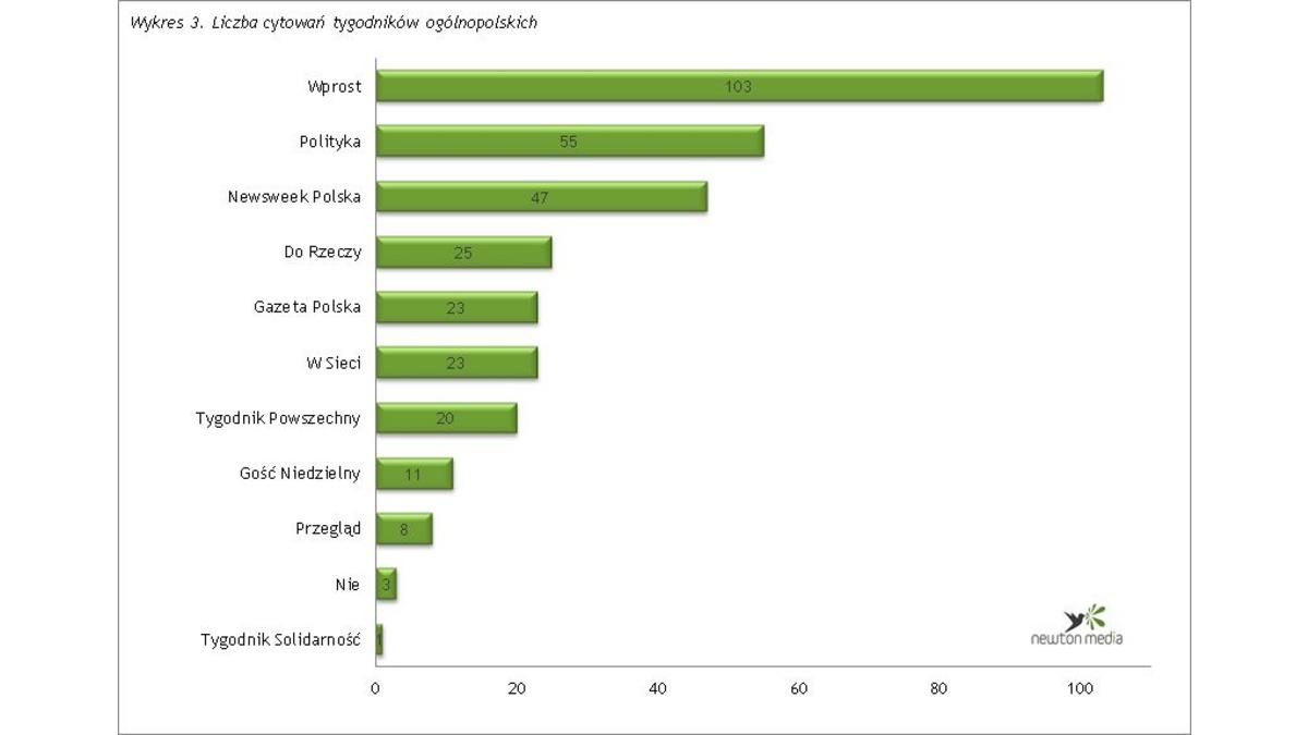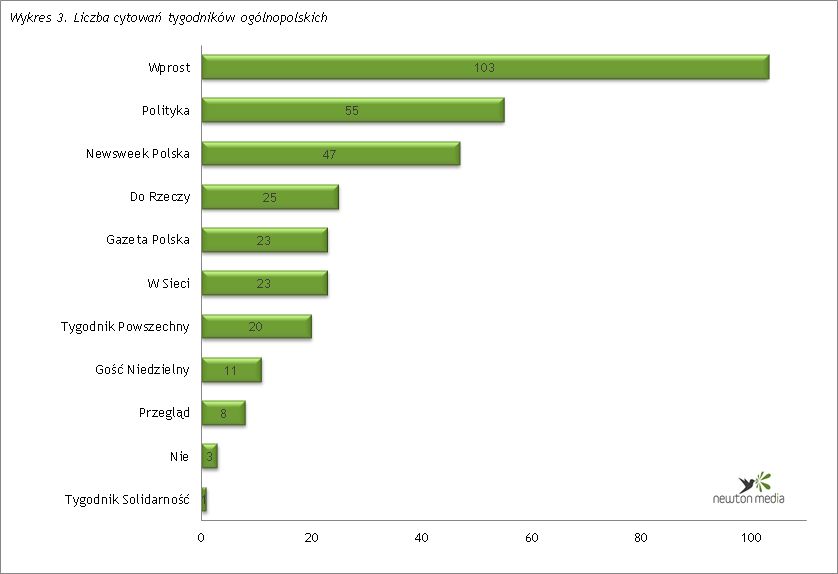 Wśród tygodników ogólnopolskich pierwsze miejsce zajęło Wprost (103). Zdecydowanie najczęściej powoływano się na kolejny artykuł tygodnika dotycz?cy Tomasza Kaczmarka. Według publikacji poseł, znany też jako agent Tomek, jeszcze do niedawna miał kontakty z osobami zwi?zanymi z warszawskimi agencjami towarzyskimi („Agent Tomek i niegrzeczne towarzystwo”, 7-12 stycznia 2014 r.). Drugie miejsce zajęła Polityka (55), a trzecie przypadło Newsweekowi Polska (47).