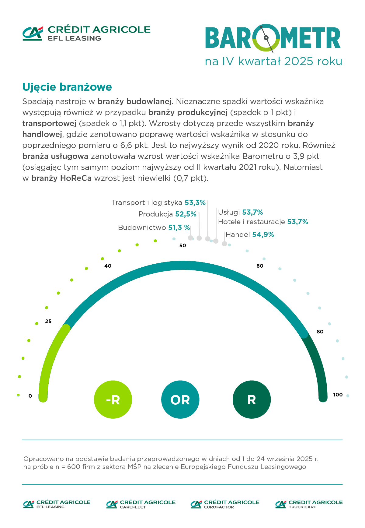 Optymizmem napawają także prognozy dotyczące zapotrzebowania finansowego. Co dziesiąty handlowiec wskazuje na wzrost zapotrzebowania na dodatkowe fundusze, kwartał wcześniej taką deklarację złożył co czwarty zapytany. To o tyle optymistyczny wniosek, że obecnie leasing czy kredyt częściej służą do regulowania bieżących zobowiązań, niż do finansowania inwestycji. Wartość głównego indeksu Barometru EFL na IV kwartał 2025 roku wyniosła 53,4 pkt. Osiągnięty poziom jest o 1,9 pkt. wyższy niż w III kwartale 2025 roku.