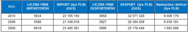 W 2010 r. polskie firmy działające w Polsce wyeksportowały do Francji towary za 32,57 mld zł. To znaczący wzrost od 2008 r., gdy wartość ta wynosiła 25,18 mld zł – wynika z danych GUS. Import w latach 2008-2010 spadł, ale nieznacznie i wyniósł 23,17 mld zł (wobec 23,49 mld zł w 2008 r.). Nadwyżka Polski w handlu z Francją wzrosła z 1,7 mld zł w 2008 r. do 9,4 mld w 2010 r.
