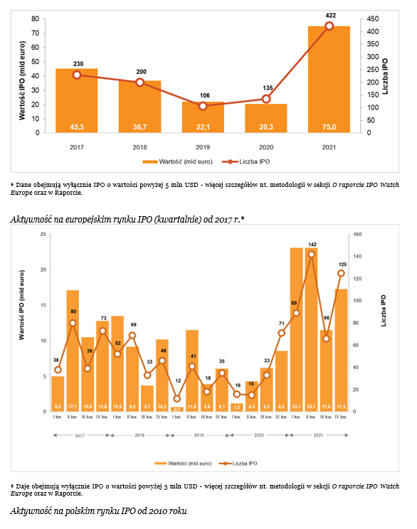„W skali Europy, rok 2021 był wyjątkowy, zarówno pod względem liczby debiutów, jak i wartości ofert. 422 IPO, z czego 14 debiutów z ofertami powyżej 1 mld euro potwierdzają optymizm na rynku po okresie niepewności wywołanym pandemią. Prognozy na rok 2022 pozostają ostrożnie pozytywne, należy spodziewać się w szczególności jeszcze większej selektywności inwestorów wynikającej zarówno z niepewnej sytuacji geopolitycznej i gospodarczej, jak i z obserwowanych spadków notowań wielu zeszłorocznych debiutantów” - dodaje Bartosz Margol.