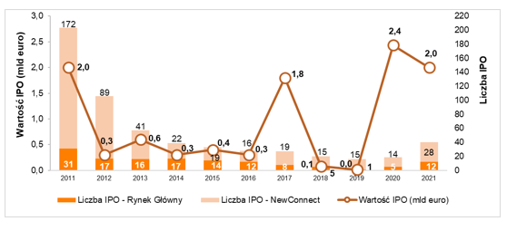 W 2021 roku na Giełdzie Papierów Wartościowych w Warszawie było 40 debiutów wobec 19 w roku ubiegłym. Łączna wartość przeprowadzonych ofert na GPW w minionym roku (łącznie na rynku regulowanym oraz NewConnect) wyniosła 9,313 mld zł (2,050 mld euro), co oznacza spadek o 15% w porównaniu do 2020 r (warto zaznaczyć, że zeszłoroczne statystyki zdominowało IPO Allegro.eu o wartości 10,6 mld zł).