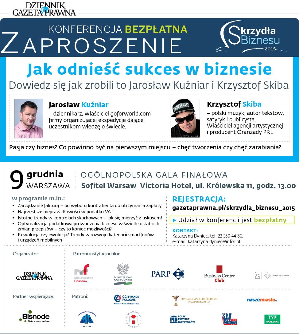 Partner • Partenaires Jak odnieść sukces w biznesie? Zaproszenie na bezpłatną konferencję 26/11/2015 • by : t.szyszlo(@)wp.pl<p>Konferencja odbędzie się 9 grudnia, Warszawa, Sofitel Warsaw Victoria Hotel, ul. Królewska 11, godz. 13:00</p>>