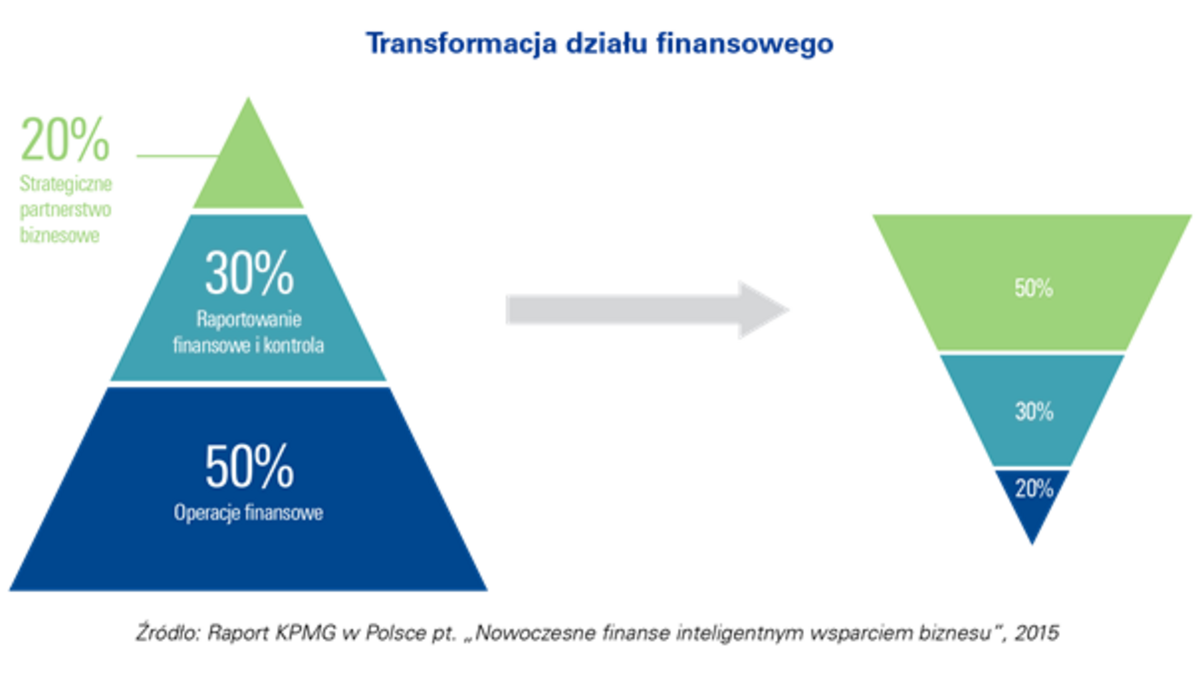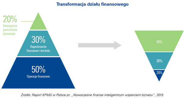 W tradycyjnych przedsiębiorstwach zespoły finansowe aż połowę czasu poświęcaj? na operacje finansowe. W nowoczesnych finansach obserwuje się d?żenie do zwiększenia udziału w strategicznym partnerstwie biznesowym, osi?gaj?c 50% i zmniejszaj?c jednocześnie zaangażowanie w operacje finansowe do 20%. Budowanie nowoczesnego działu finansowego w organizacji przyszłości z wykorzystaniem jego silnych stron i eliminowaniem słabych, wychodzi poza obecne, tradycyjne rozumienie obowi?zków jako raportowania finansowego i kontroli oraz d?ży do aktywnego wspierania zarz?dzaj?cych biznesem - wiarygodnie, szybko i kompletnie opisuj?c w raportach finansowych rzeczywistość biznesow? zwiększaj?c w ten sposób świadomość podejmowanych decyzji strategicznych.