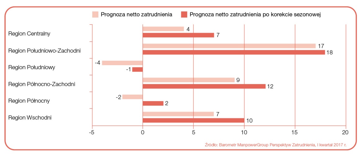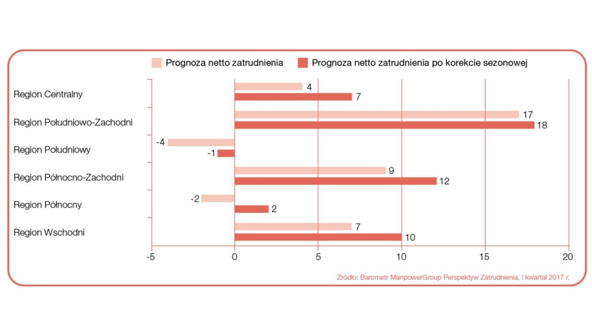 W pięciu z sześciu badanych regionach PolskiWięcej na temat...2 prognoza netto zatrudnienia dla I kwartału 2017 r. jest dodatnia. Oznacza to, że w większości kraju przeważa optymizm pracodawców co do planów zwiększania liczby etatów w nadchodz?cym kwartale. Najwyższ? notę uzyskano w oparciu o deklaracje pracodawców z regionu Południowo-Zachodniego, dla którego odnotowano wynik +18%. Zauważalny optymizm panuje również w regionach Północno-Zachodnim oraz Wschodnim, odpowiednio +12% i +10%. Umiarkowany optymizm, odnotowano w Centrum, gdzie uzyskano prognozę +7%. Wynik dla Północy wyniósł +2%, sygnalizuj?c niewielk? poprawę sytuacji, podczas gdy prognoza dla Południa wyniosła -1%, wskazuj?c na niezbyt optymistyczn? sytuację.