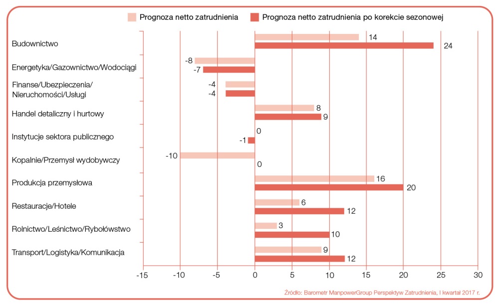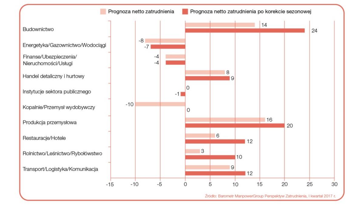 W sześciu z 10 badanych sektorachWięcej na temat...1 kraju prognoza netto zatrudnienia dla I kwartału 2017 r. jest dodatnia. Najwyższe noty uzyskano dla Budownictwa oraz Produkcji przemysłowej, dla których wyniki wyniosły odpowiednio +24% i +20%. Optymizm odnotowywany jest też dla branż Transport/Logistyka/Komunikacja, Restauracje/Hotele, +12% dla obu, Rolnictwo/Leśnictwo/Rybołówstwo, +10%, a także Handel detaliczny i hurtowy, +9%. Najniższe prognozy uzyskano dla sektorów Energetyka/Gazownictwo/Wodoci?gi oraz Finanse/Ubezpieczenia/Nieruchomości/Usługi, odpowiednio -7% i -4%. Wyniki dla obszarów Kopalnie/Przemysł wydobywczy i Instytucje sektora publicznego również wskazuj? na nieprzychylne warunki do szukania pracy, odpowiednio 0% i -1%