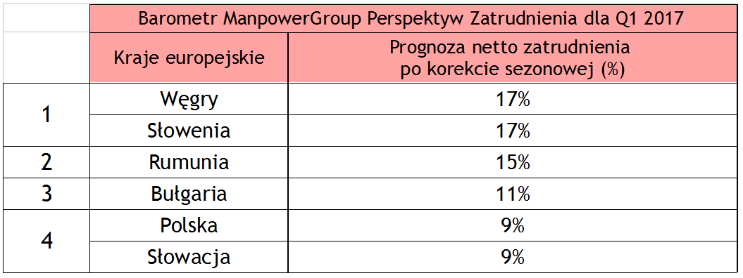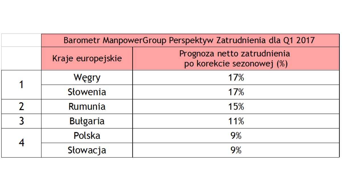 Barometr ManpowerGroup Perspektyw Zatrudnienia to kwartalne badanie, które mierzy intencje pracodawców zwi?zane ze zwiększeniem lub zmniejszeniem całkowitego zatrudnienia w ich oddziale w najbliższym kwartale. Badanie jest przeprowadzane od przeszło 50 lat, aktualnie wśród blisko 59 000 pracodawców w 43 krajach i jest jednym z najbardziej wiarygodnych badań rynku pracy na świecie. Raport dla I kwartału 2017 r. został opracowany na podstawie wywiadów indywidualnych przeprowadzonych pomiędzy 19 października a 1 listopada 2016 r. W Polsce wyniki raportu ManpowerGroup publikowane s? od II kwartału 2008 r. Badanie jest przeprowadzane na reprezentatywnej grupie co najmniej 750 pracodawców. Więcej informacji na temat raportu dostępnych jest na stronie www.manpowergroup.pl w zakładce Raporty rynku pracy/ Barometr Manpower Perspektyw Zatrudnienia.