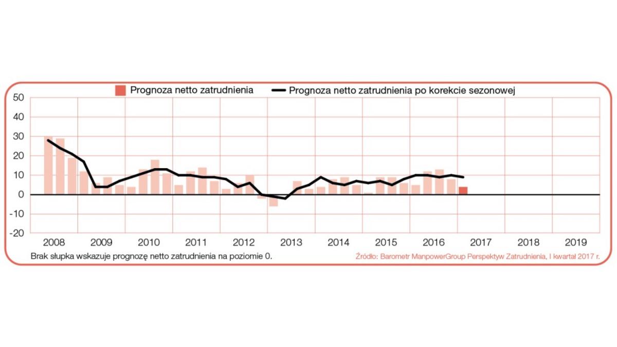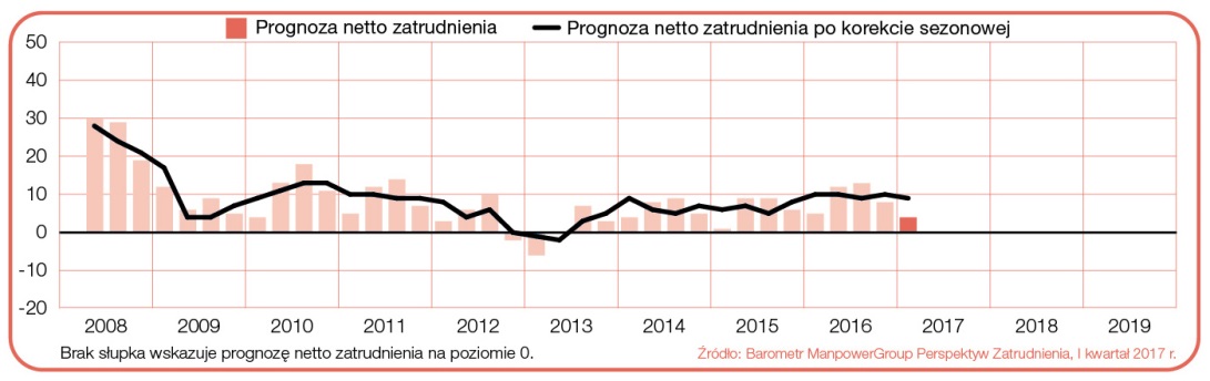 Wykres 1. Prognoza netto zatrudnienia dla Polski w ci?gu kolejnych kwartałów. Źródło: „Barometr ManpowerGroup Perspektyw Zatrudnienia”.