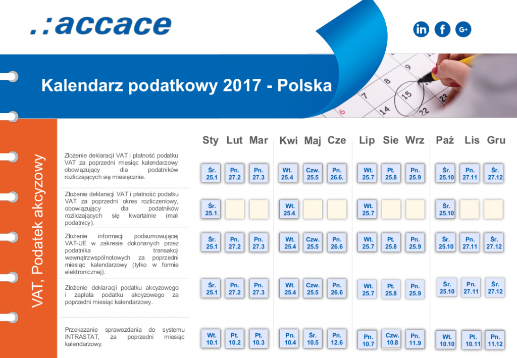 <p style="text-align: justify;">Każdy z przedsiębiorców musi pamiętać o zobowiązaniach wobec urzędu skarbowego. Zespół Accace zadbał o to aby w 2017 roku żadna z dat nie została przeoczona.</p>