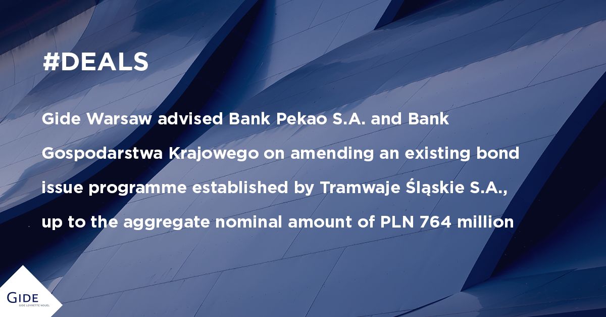 Prawnicy z praktyki rynków kapitałowych warszawskiego biura Gide doradzali Pekao S.A. oraz BGK przy zmianie dotychczasowego programu emisji obligacji, ustanowionego przez Tramwaje Śląskie S.A. poprzez m.in. podwyższenie maksymalnej kwoty programu do kwoty 764.400.000 PLN oraz przy emisji dwóch pierwszych serii obligacji po zmianie programu, o łącznej wartości 268.400.000 PLN.