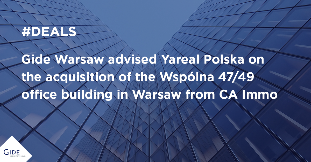 Zespół kancelarii Gide wspierał Yareal Polska na wszystkich etapach nabycia biurowca usytuowanego w sercu Warszawy. Transakcja została przeprowadzona w oparciu o nabycie 100% udziałów w spółce celowej działającej w ramach grupy CA Immo, dotychczasowego właściciela budynku. Procesy związane z zarządzaniem nieruchomością oraz wynajmem powierzchi przejmuje w pełni Yareal Polska.