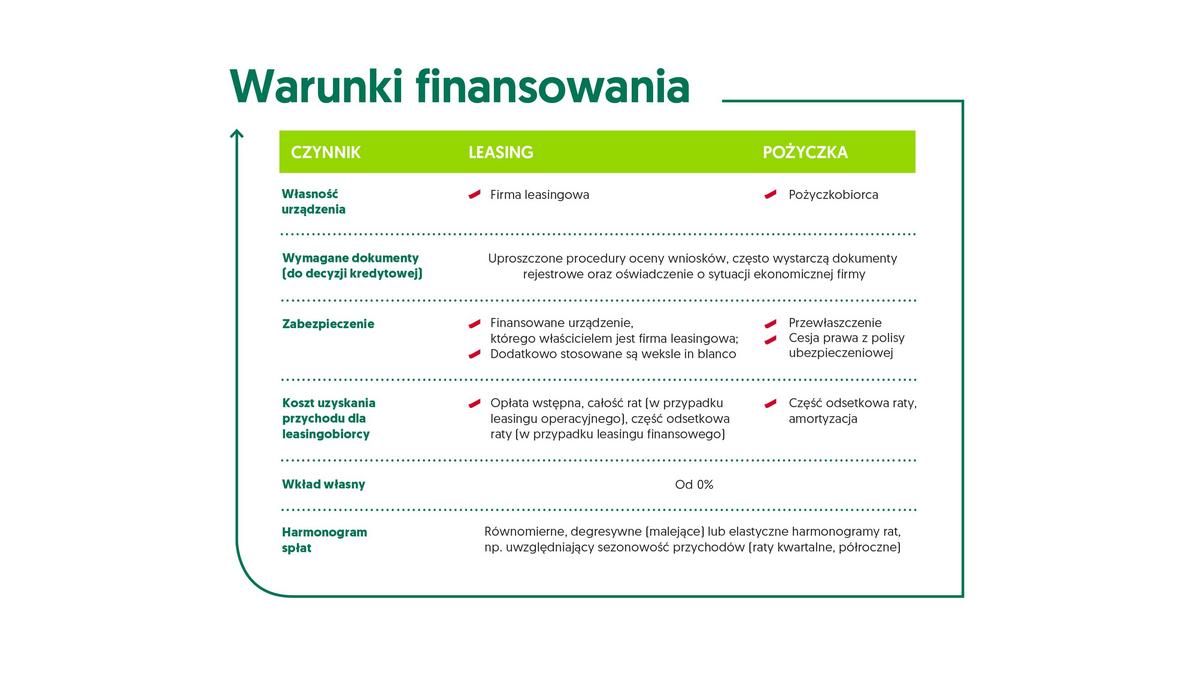 - Z usług instytucji finansowych mog? korzystać firmy o różnym profilu i różnej skali działania. Oferta skierowana do klienta jest silnie zindywidualizowana i decyzja o tym, czy leasing czy pożyczka, ostatecznie będzie zależeć od potrzeb działalności oraz innych dodatkowych czynników takich jak wysokość wpłaty własnej, wartość i okres całej inwestycji czy rodzaj finansowania. Warto jednak zwrócić uwagę na korzyść podstawow? – dzięki finansowaniu zewnętrznemu, przy wyborze potrzebnego sprzętu, możemy skupić się na jego jakości, a nieograniczonym budżecie. Nawet w sytuacji, gdy posiadamy środki własne, wzięcie pożyczki czy zawarcie umowy leasingowej, może okazać się korzystniejsze – mówi Marcin Stasiak, Kierownik ds. Produktów i Rozwoju Rynków w EFL.