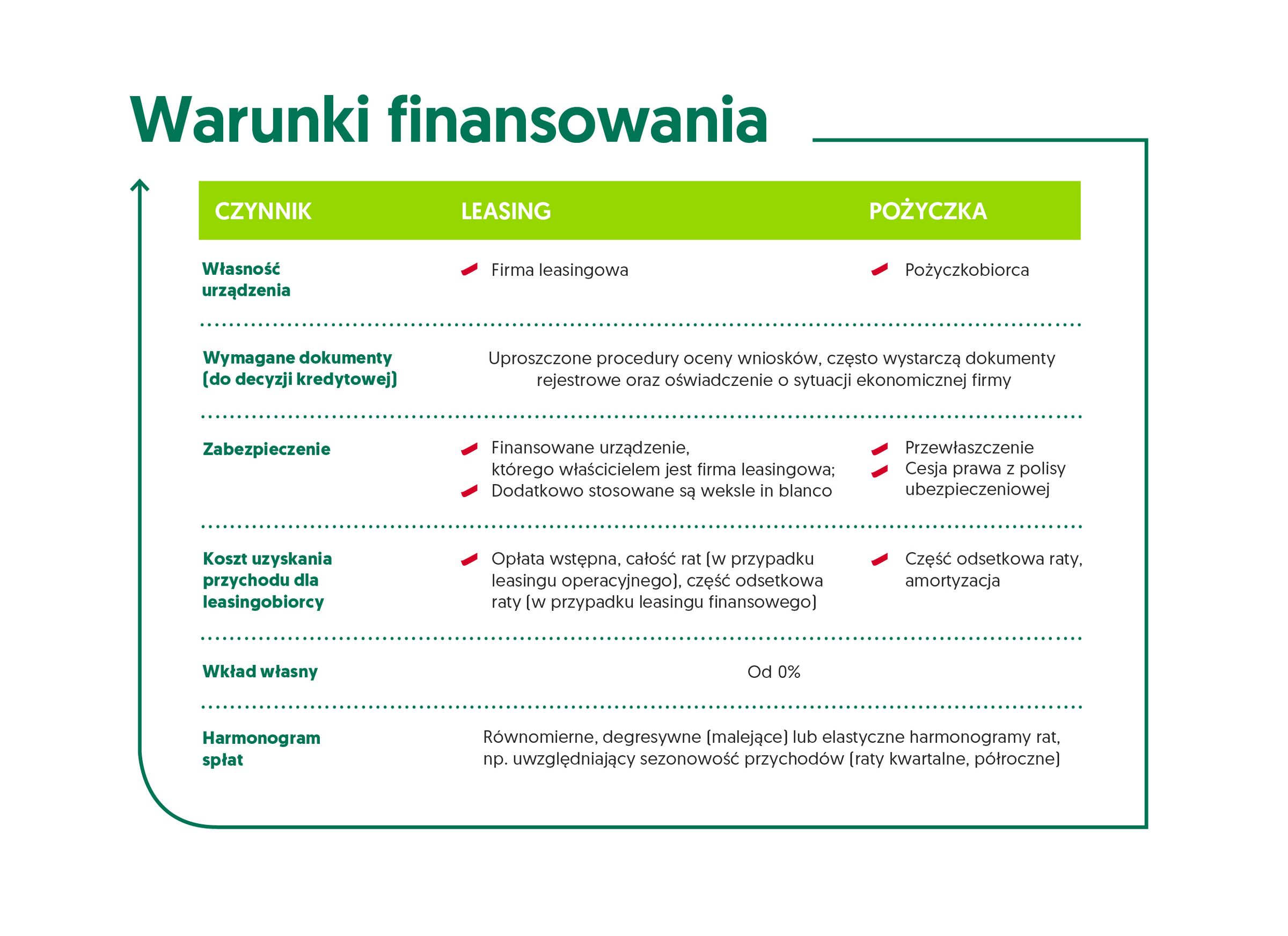 - Łatwość uzyskania: leasingodawcy stawiaj? mniej wymogów, jeżeli chodzi o liczbę i szczegółowość koniecznych dokumentów czy procedur, ze względu na to, że przedmiot leasingu przez cały czas spłaty pozostaje własności? firmy leasingowej.