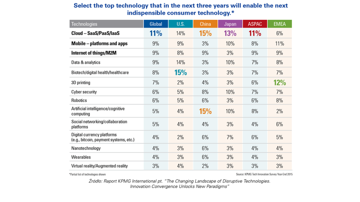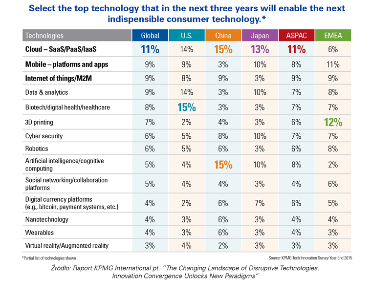 Jak wynika z globalnego badania KPMG, przeprowadzonego wśród ponad 800 liderów technologii i biznesu, nadal największe znaczenie maj? chmury obliczeniowe i rozwi?zania mobilne zarówno dla indywidualnych konsumentów, jak i dla biznesu. Jednak ich przewaga nad pozostałymi nowymi technologiami zmniejszyła się kolejny rok z rzędu. Kluczow? rolę chmur obliczeniowych wskazało 14% respondentów, natomiast znaczenie platform i aplikacji mobilnych, jako technologii przełomowych dla przemysłu, konsumentów i tworzenia nowych modeli biznesowych wskazywało 9% respondentów. Istotne znaczenie maj? też takie rozwi?zania technologiczne, jak internet rzeczy (9%), analizy danych (9%), inżynieria biomedyczna wraz z cyfrowymi rozwi?zaniami medycznymi, druk 3D (7%) oraz rozwi?zania zwi?zane z cyberbezpieczeństwem, czyli poprawiaj?ce bezpieczeństwo danych w świecie cyfrowym (6%).