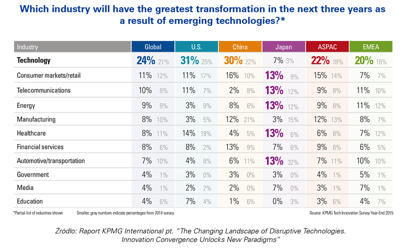 Badanie KPMG International pt. „The Changing Landscape of Disruptive Technologies. Innovation Convergence Unlocks New Paradigms”, przeprowadzono na przełomie sierpnia i września 2015 roku metod? wywiadów internetowych na próbie 832 liderów technologii z 17 krajów, w tym z krajów europejskich (Wielka Brytania, Holandia, Niemcy Słowacja). Największ? część respondentów stanowili prezesi i członkowie zarz?dów (87%). Ponad połowę (64%) stanowiły duże i średnie przedsiębiorstwa, 27% respondentów stanowili właściciele start-up’ów, a 9% inwestorzy z funduszy typu venture capital. Badanie przestawia światowe trendy na rynku nowych technologii w perspektywie kolejnych 3 lat.
