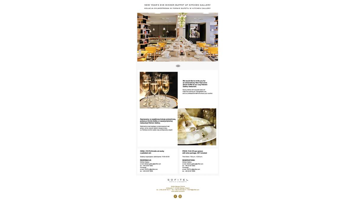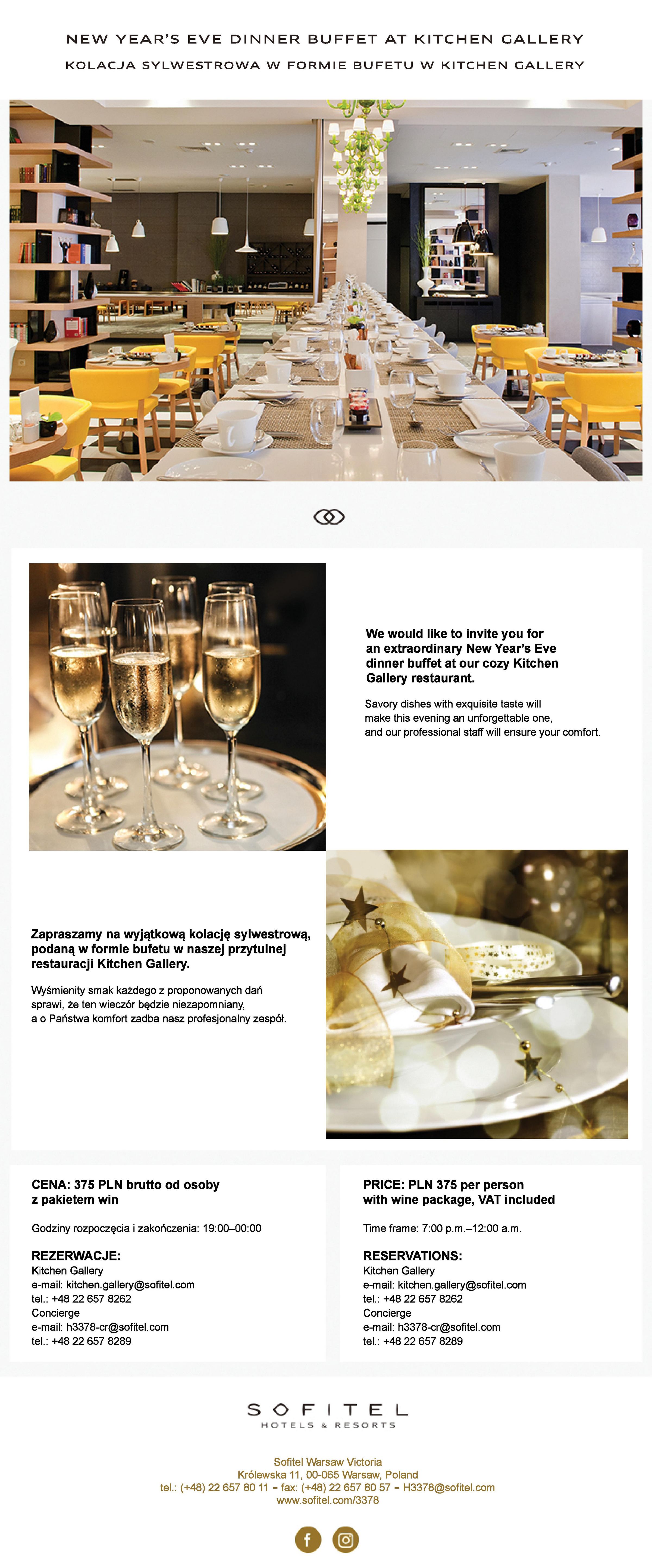 <p style="text-align: justify;">Zapraszamy na wyjątkową kolację sylwestrową, podaną w formie bufetu w naszej przytulnej restauracji Kitchen Gallery. Wyśmienity smak każdego z proponowanych dań sprawi, że ten wieczór będzie niezapomniany, a o Państwa komfort zadba nasz profesjonalny zespół. </p>