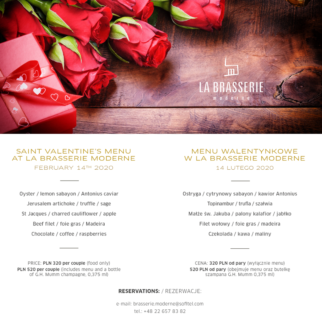 Święto Zakochanych zbliża się dużymi krokami. Z tej okazji zapraszamy Państwa na wyjątkową kolację do restauracji La Brasserie Moderne. By podkreślić urok wieczoru, nasz szef kuchni Maciej Majewski przygotował wyśmienite menu, skomponowane ze składników, które wprowadzą Państwa w romantyczny nastrój.