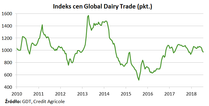 <p style="text-align: justify;">Wczoraj odbyła się aukcja produktów mlecznych na platformie aukcyjnej Global Dairy Trade (GDT) w Nowej Zelandii. Indeks cen GDT zmniejszył się na niej do 970 pkt. wobec 986 pkt. na poprzedniej aukcji, przeprowadzonej 4 lipca br. (spadek o 1,6%), co było poniżej oczekiwań rynku przybliżanych kontraktami terminowymi na pełne mleko w proszku, odtłuszczone mleko w proszku oraz bezwodny tłuszcz mleczny na giełdzie w Nowej Zelandii. Jest to już czwarty z rzędu spadek indeksu GDT. Tym samym indeks cen GDT ukształtował się na najniższym poziomie od grudnia 2017 r.</p>