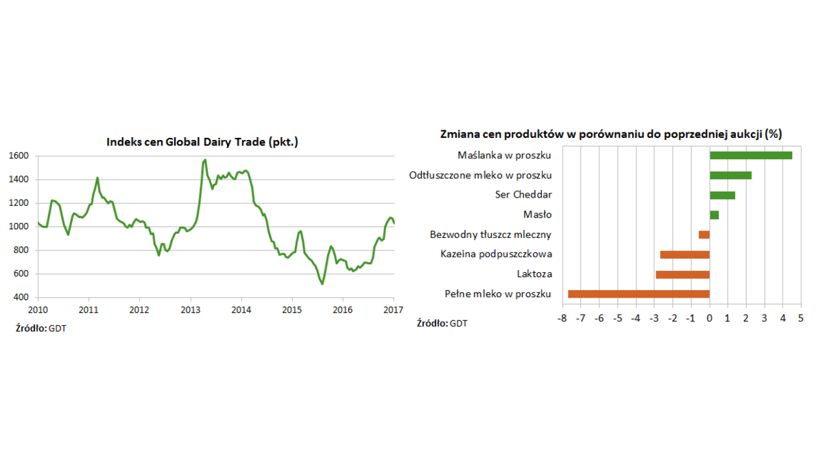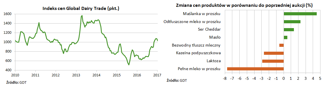 <p style="text-align: justify;">Wczoraj miała miejsce aukcja produktów mlecznych na platformie aukcyjnej Global Dairy Trade (GDT) w Nowej Zelandii. Indeks cen GDT zmniejszył się na niej do 1034 pkt. wobec 1076 pkt. na poprzedniej aukcji, która miała miejsce 20 grudnia 2016 r. (spadek o 3,9%), co było wyraźnie poniżej oczekiwań rynku przybliżanych kontraktami terminowymi na pełne mleko w proszku, odtłuszczone mleko w proszku oraz bezwodny tłuszcz mleczny na giełdzie w Nowej Zelandii.</p>