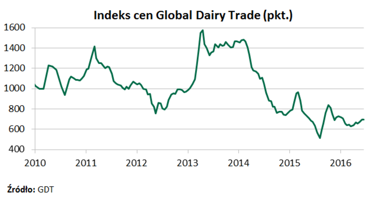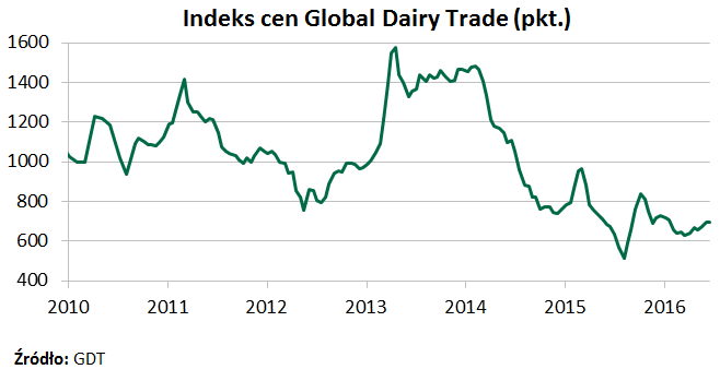 Kontynuacja szerokiego zakresu wzrostu cen na wczorajszej aukcji GDT stanowi wsparcie dla naszego scenariusza, zgodnie z którym mamy obecnie do czynienia z punktem zwrotnym w cyklu na globalnym rynku mleka i w IV kw. rozpocznie się trwały wzrost cen mleka i produktów mlecznych na światowym rynku (por. AGROmapa z 15.06.2016).