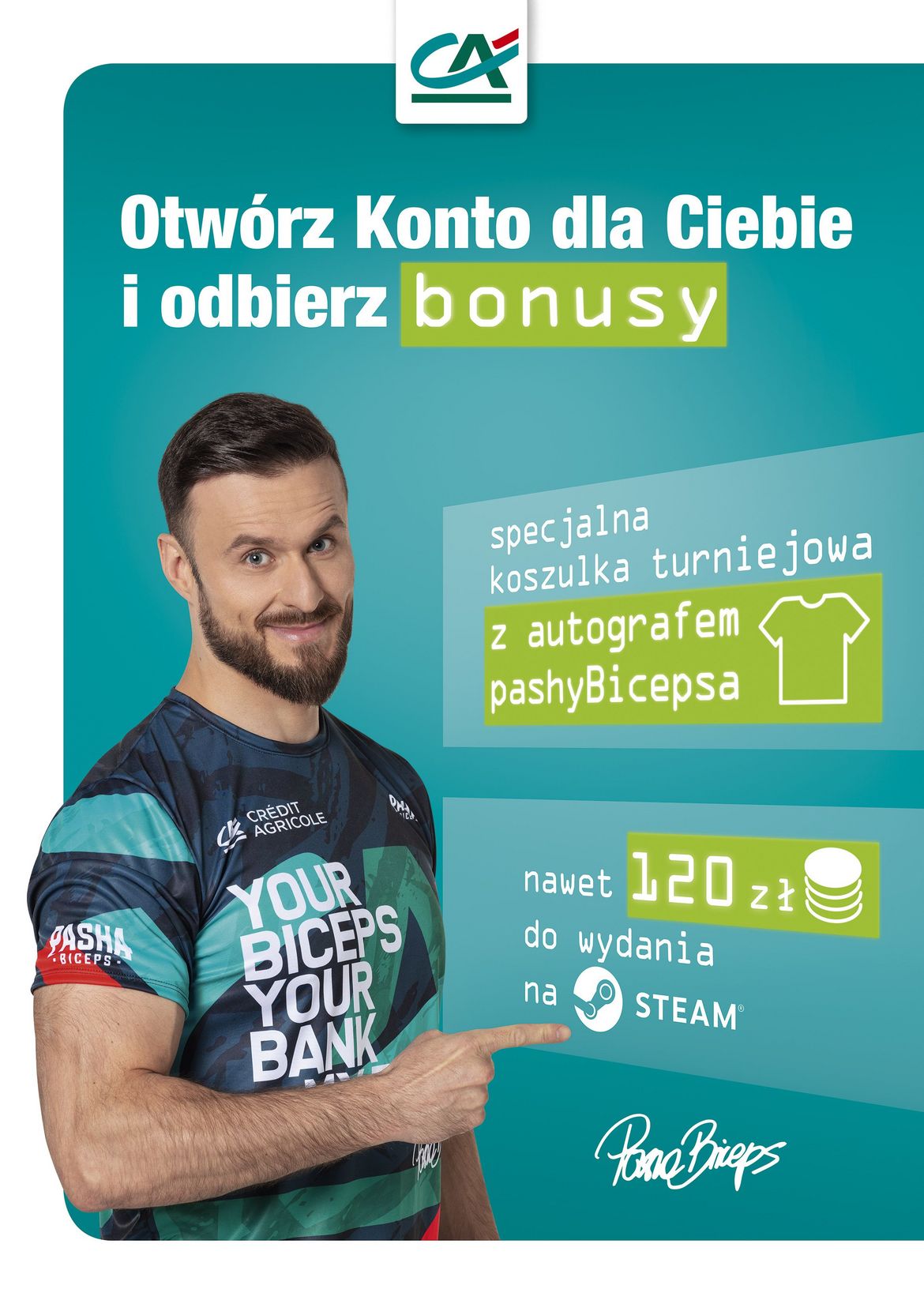 Credit Agricole rusza ze specjalną ofertą dla graczy i wchodzi we współpracę Jarosławem pashąBicepsem Jąrząbkowskim oraz Mastercard. W promocji klienci mogą zdobyć limitowaną koszulkę turniejową z podpisem pashyBicepsa oraz nawet 120 zł do wykorzystania na platformie Steam. Z myślą o graczach i fanach pashyBicepsa, Credit Agricole wprowadził też trzy nowe wizerunki kart do konta z podpisem e-sportowca.