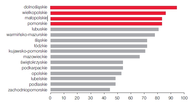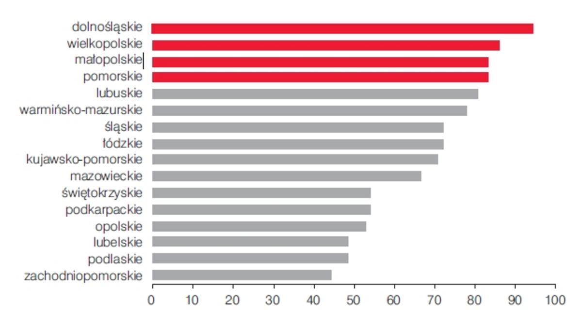 W osi efektywnej gospodarki finansowej na czele uplasowały się województwa: dolnośl?skie (94 pkt), wielkopolskie (86 pkt) oraz małopolskie i pomorskie (po 83 pkt). Na końcu stawki znalazły się województwa: zachodniopomorskie (44 pkt) oraz podlaskie i lubelskie (49 pkt).