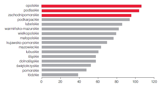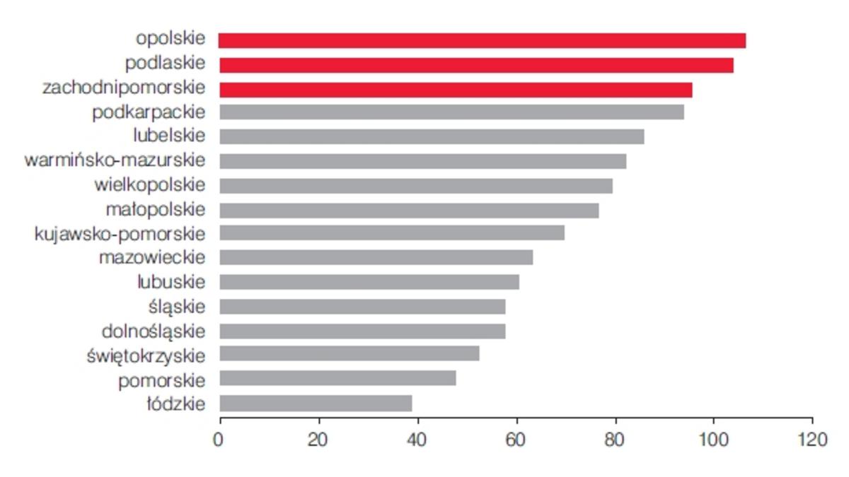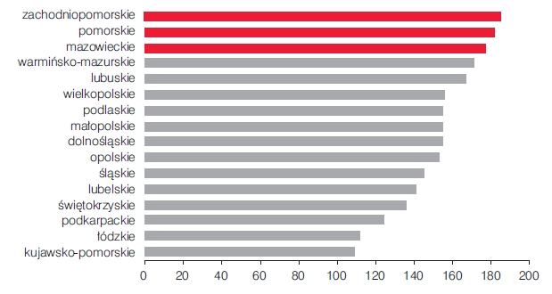 Najlepszy wynik osi?gnięto w zakresie poprawy stanu zdrowia w województwie zachodniopomorskim (185 pkt) oraz pomorskim i mazowieckim (182 i 175 pkt). Kolejne cztery województwa: warmińsko-mazurskie, lubuskie, wielkopolskie i podlaskie nie pozostaj? daleko w tyle za trójk? liderów. Na końcu listy znajduj? się województwa kujawsko-pomorskie i łódzkie z wartościami odpowiednio 109 i 112 pkt.