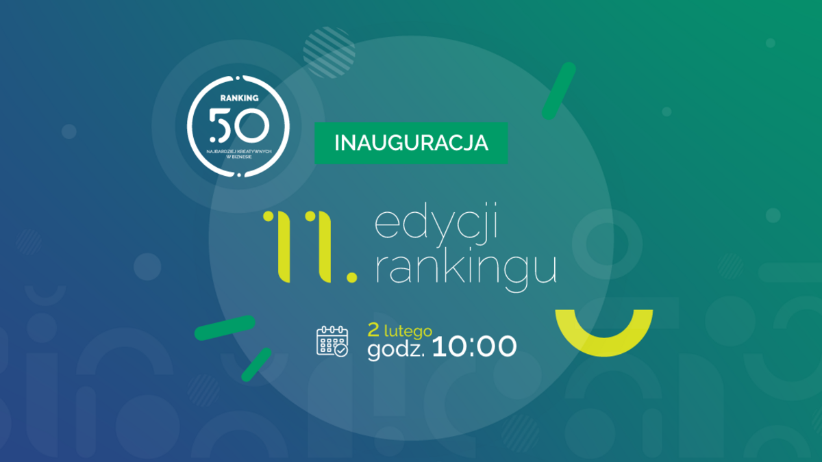 2 lutego o 10:00 zapraszamy na oficjalną inauguracje 11. edycji rankingu 50. Najbardziej Kreatywnych Ludzi w Biznesie.