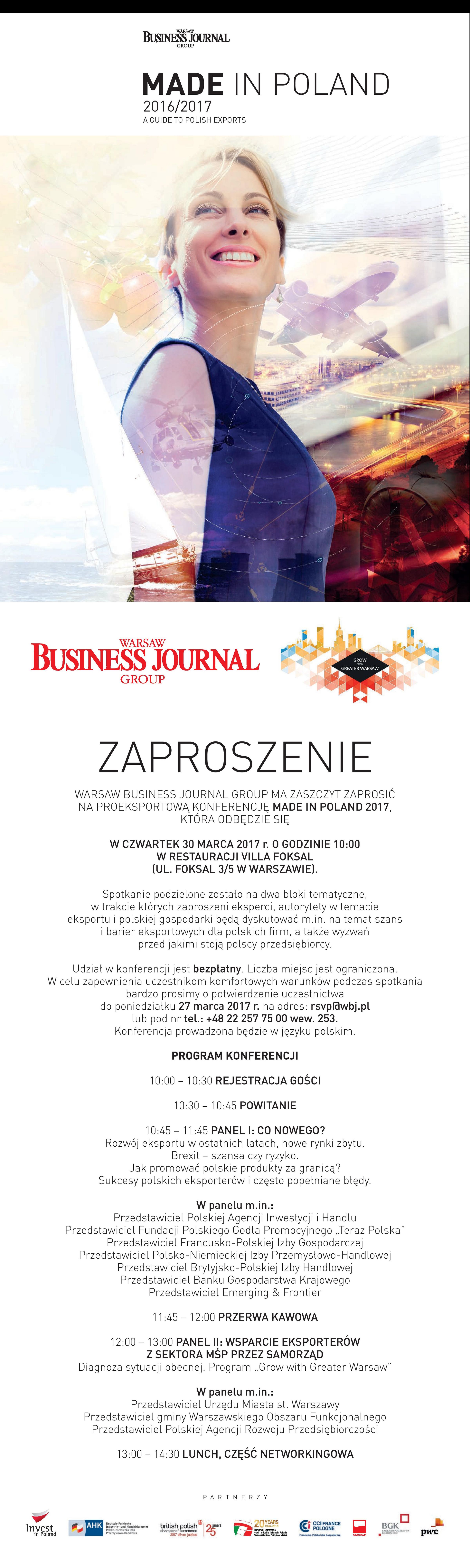 <p style="text-align: justify;">Warsaw Bussines Journal Group ma zaszczyt zaprosić na proeksportową konferencję <strong>MADE IN POLAND 2017</strong>, która odbędzie się w czwartek 30 marca 2017 r. o godzinie 10:00 w restauracji Villa Foksal (ul. Foksal 3/5 w Warszawie).</p>