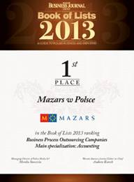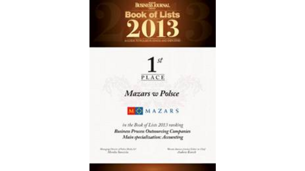 <p style="text-align: justify;">Miło nam poinformować, że firma Mazars zajęła pierwsze miejsce w rankingu „Book of Lists 2013” w kategorii: Business Process Outsourcing Companies (Accounting).</p>