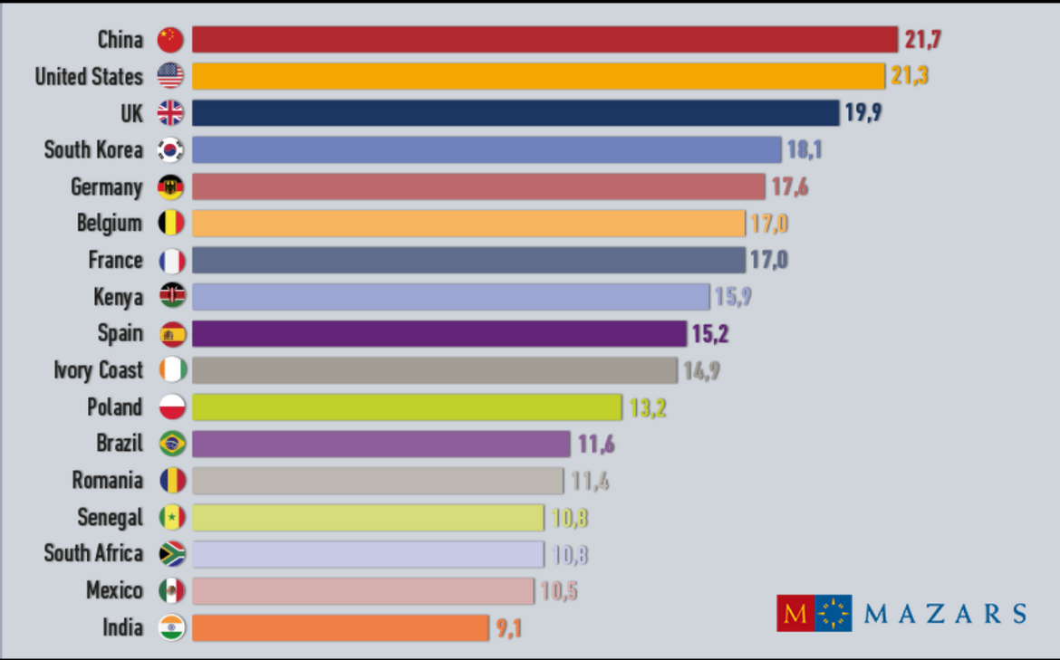 Chiny jako kraj numer 1 w Indeksie Płatności Mobilnych Mazars znacznie wyprzedza inne kraje pod względem płatności dokonywanych za pomocą telefonu. Ilość takich transakcji na rynku zdominowanym przez dwa giganty technologiczne: WeChat Pay firmy Tencent oraz Alipay koncernu Alibaba, wzrosła aż dziesięciokrotnie od 2012 roku.