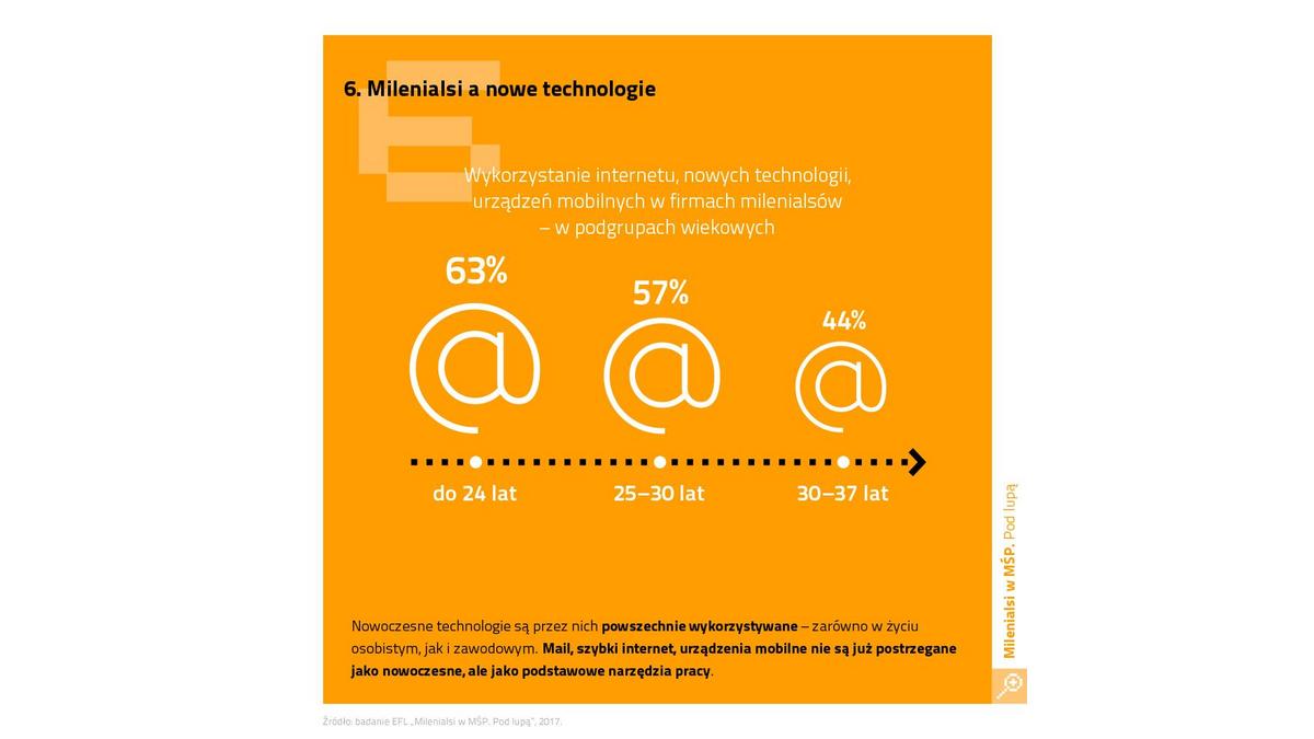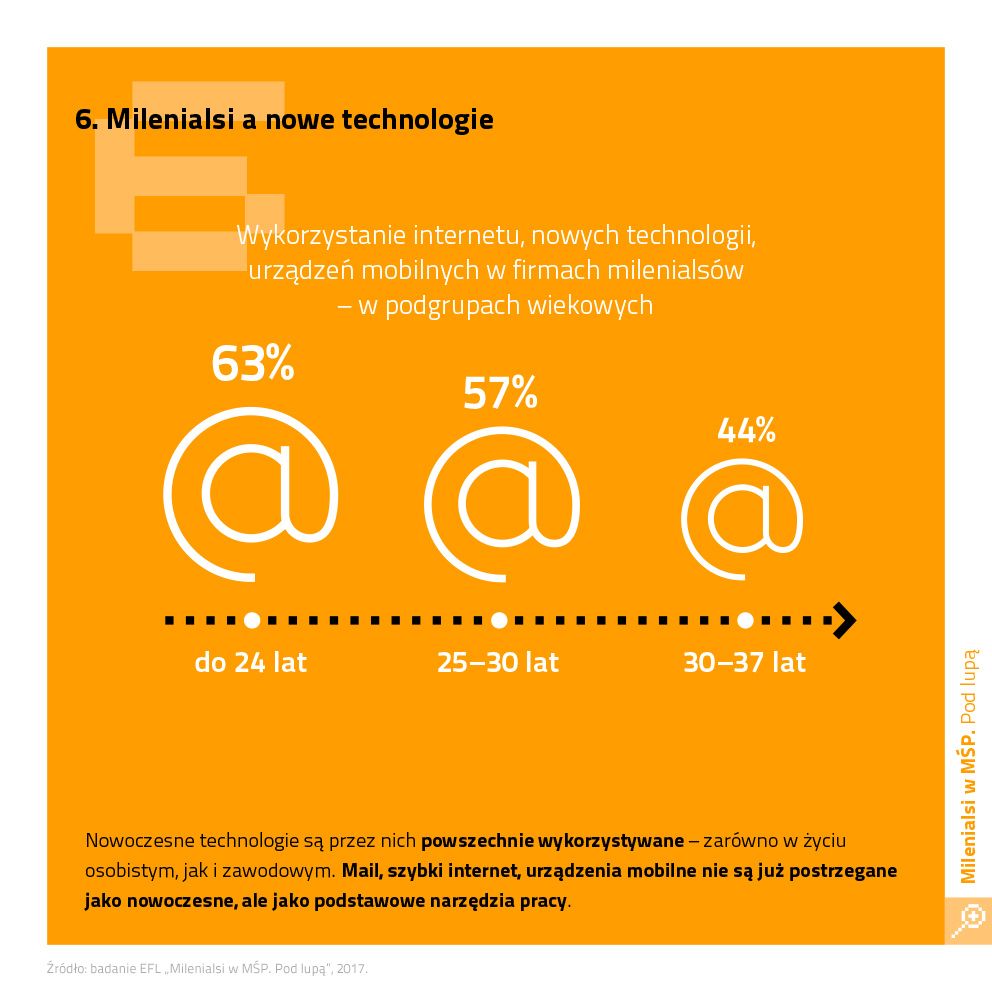 EFL w badaniu „Milenialsi w MŚP. Pod lup?” poprosił przedsiębiorczych Y, aby sami sprecyzowali, co rozumiej? pod pojęciem nowoczesnych technologii nie czytaj?c możliwych odpowiedzi. Co ciekawe, 12 proc. badanych wskazało, że w pracy nie wykorzystuje nowoczesnych technologii, a kolejne 15 proc. odpowiedziało, że nie wie. Wśród pozostałych rzuca się w oczy tradycyjne rozumienie tego pojęcia. Blisko połowa wskazywała na wykorzystywanie w pracy sprzętu komputerowego, telefonów komórkowych i narzędzi internetowych – najczęściej maili. Blisko co trzeci korzysta ze specjalistycznych maszyn oraz zaawansowanych programów i aplikacji. Rzadziej wskazywano na technologie czerpi?ce z IT takie jak nawigacja (np. w traktorach), monitoring, karty automatyczne (np. wstępu) czy wreszcie terminale płatnicze.