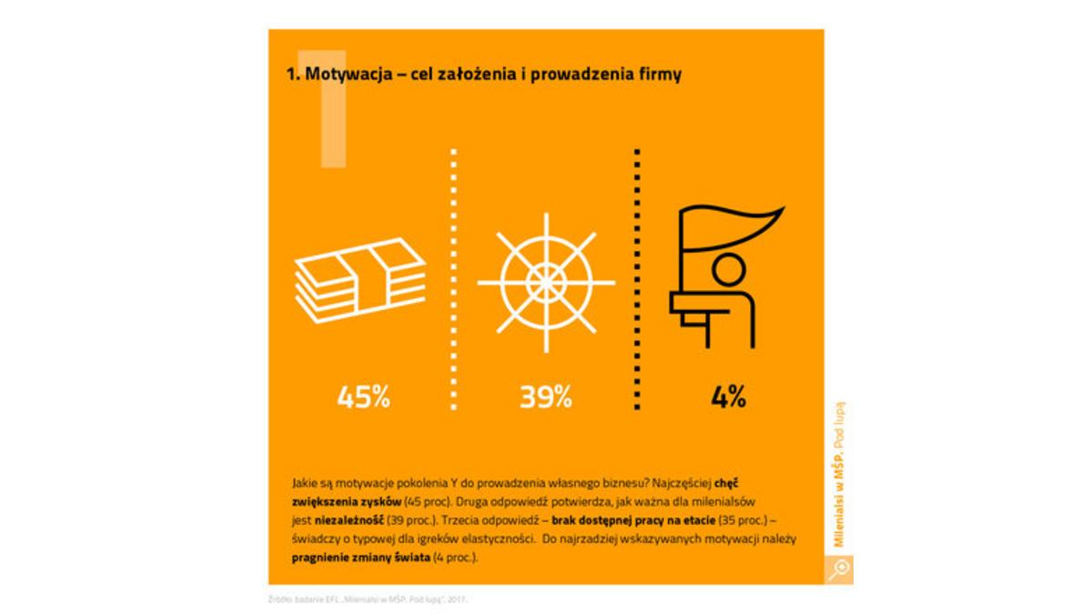 Główny powód założenia własnego biznesu przez milenialsów jest finansowy i materialny. Na chęć zwiększenia dochodów wskazała niemal połowa przedstawicieli pokolenia Y (45 proc.). Warto jednak zwrócić uwagę na drug? najczęstsz? odpowiedź, która potwierdza, jak ważna dla milenialsów jest niezależność. Takiej odpowiedzi udzieliło 39 proc. „igreków”. Trzecia odpowiedź – brak dostępnej pracy na etacie (35 proc.) świadczy o typowej dla nich elastycznej postawie. I co ciekawe, co czwarty zapytany wyraził niechęć do pracy na etacie (24 proc.). Wśród najrzadziej wskazywanych motywacji było zaś pragnienie zmiany świata (4 proc.).