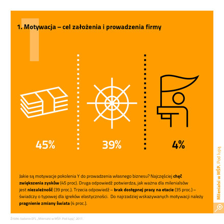 Raport, oparty m.in. na badaniach firm, w szerszym kontekście odpowiada na pytanie o specyfikę milenialsów jako przedsiębiorców z obszaru MŚP, także w zestawieniu z obrazem poprzedniego pokolenia X. Opiera się na badaniach zleconych przez EFL S.A. niezależnemu podmiotowi (Ecorys Polska), rozbudowanych o kontekst społeczno-ekonomiczny i psychologiczno-społeczny dotycz?cy procesów zwi?zanych ze zmian? pokoleniow? w polskiej gospodarce.