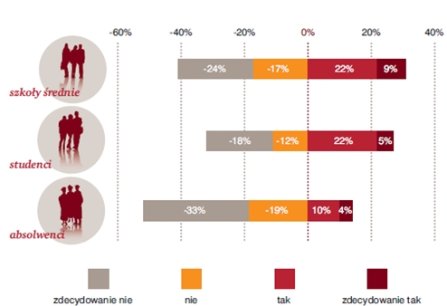 Aż 62% uczniów szkół średnich (licea i technika) uważa, że ma już sprecyzowane plany zawodowe. Blisko 1/3 z nich decyzję o dalszej karierze podjęła w trakcie nauki w szkole średniej, a 27% wskazuje na wcześniejszy etap swojej edukacji. Z kolei, w przypadku studentów tylko 17% twierdzi, że nie ma jeszcze planów zawodowych. Po ukończeniu studiów pewność ta zanika. Odsetek niezdecydowanych wśród absolwentów jest wyższy i wynosi 25%.