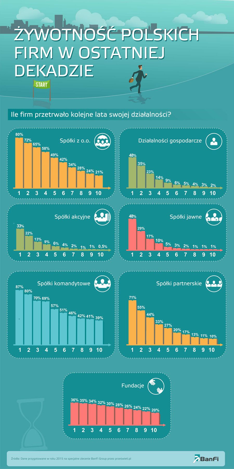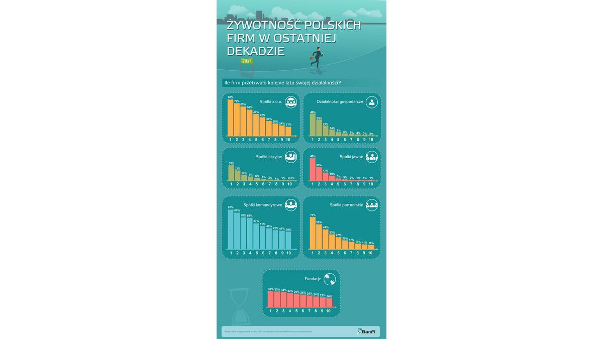 Po dziesięciu latach od rejestracji na rynku działa jedynie 5,89% firm. Wśród nich najbardziej liczn? reprezentacj? s? spółki komandytowe, które stanowi? aż 40% wspomnianej wartości. Kolejne miejsce na podium znajduj? ex aequo spółki z ograniczon? odpowiedzialności? i fundacje, które mog? się pochwalić 20% przeżywalności?. Stawkę zamykaj? spółki akcyjne i jawne, spośród których dekadę przetrwało mniej niż 1%.